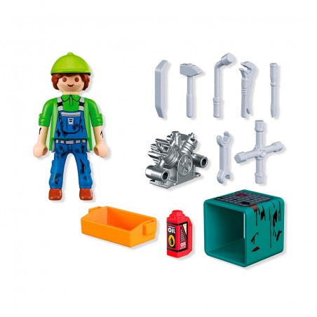 Mecánico de PLAYMOBIL Special Plus. ¡El mecánico está listo para el próximo trabajo! Con una llave de tuercas, un bidón de aceite y una caja repleta de herramientas, hará que cualquier motor vuelva a funcionar.