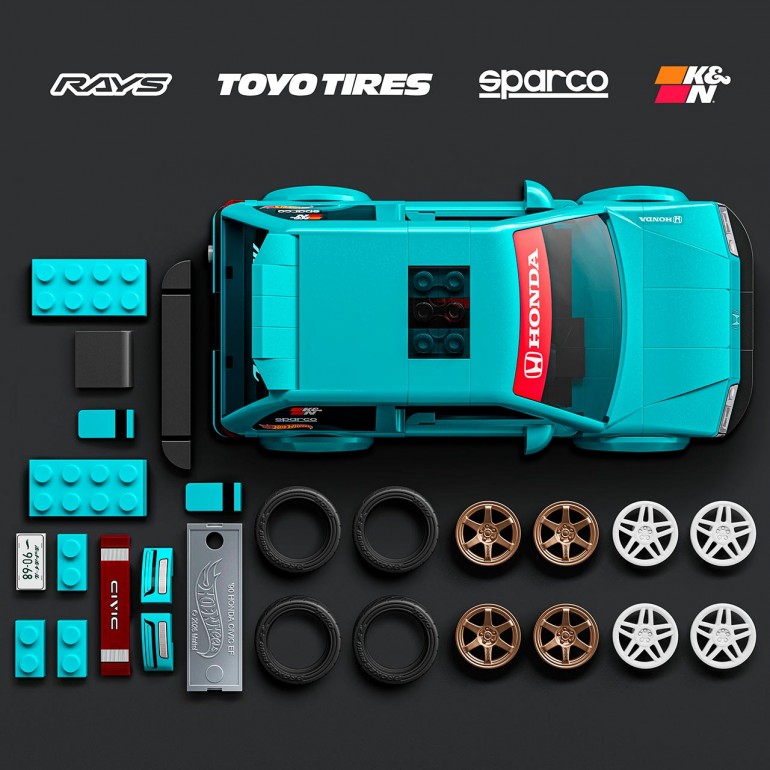 Construye el icono de los 90, Custom '90 Honda Civic EF a escala 1:32 para construir por completo lleno de detalles realistas. Incluye una hoja de pegatinas para personalizarlo y 2 juegos de tapacubos para transformar tu vehículo. Incluye un coche de metal a escala 1:64 y una matrícula distintiva, disponible primero con los conjuntos de Mattel Brick Shop. Con puertas que se abren, ventanas auténticas y faros.