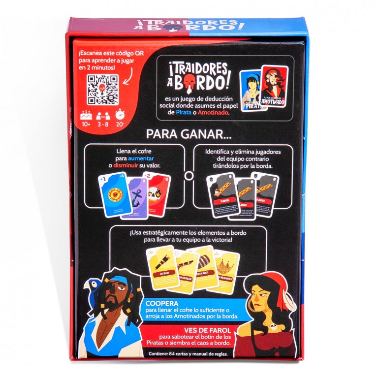¡Traidores abordo! Es un juego de roles ocultos que combina estrategia, engañose interacciones sociales. Asume el papel de un pirata que intentará llenar el cofre de la tripulación o de un amotinado que hará todo lo posible para sabotear el botín. A lo largo del juego, asegúrate de discutir, cuestionar y compartir información (verdadera o falsa) con los Demás para coordinar tus esfuerzos o traicionarlos en el momento adecuado... ¿Serás capaz de identificar a los miembros de tu equipo, ser astuto y usar los objetos a bordo del barco de forma estratégica para ganar? ¡Ahora, el destino de la tripulación está en tus manos!