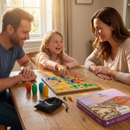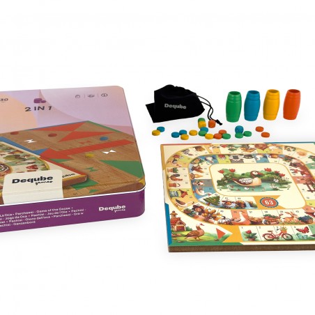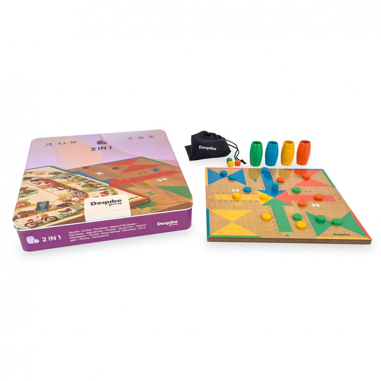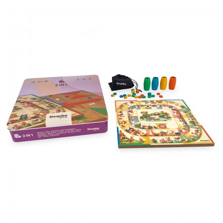 Clásicos juegos de Parchís y Oca en una práctica caja metálica, con fichas de madera FSC. Perfecto para llevar de viaje o disfrutar en familia. Diseño duradero, ecológico y divertido que mantiene viva la tradición del juego de mesa.