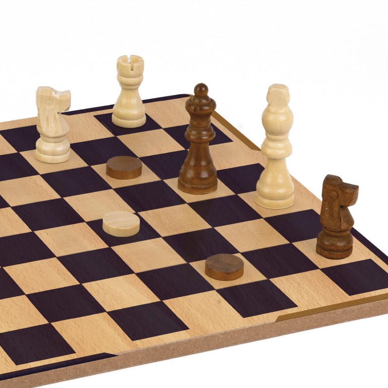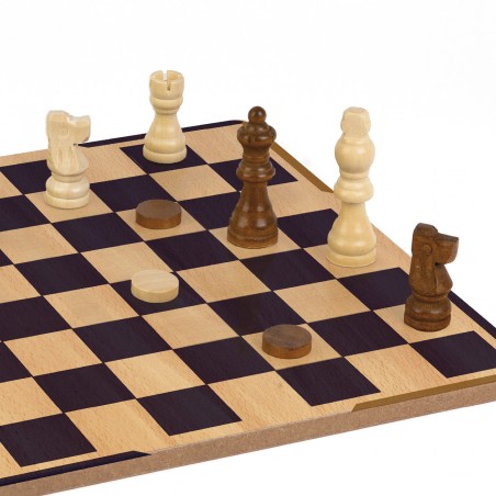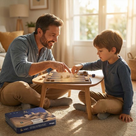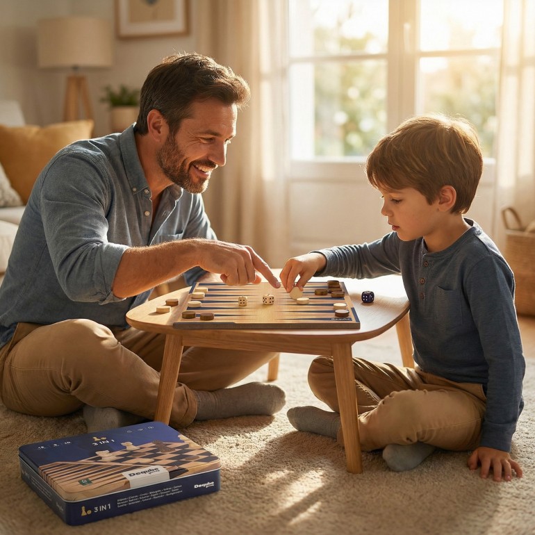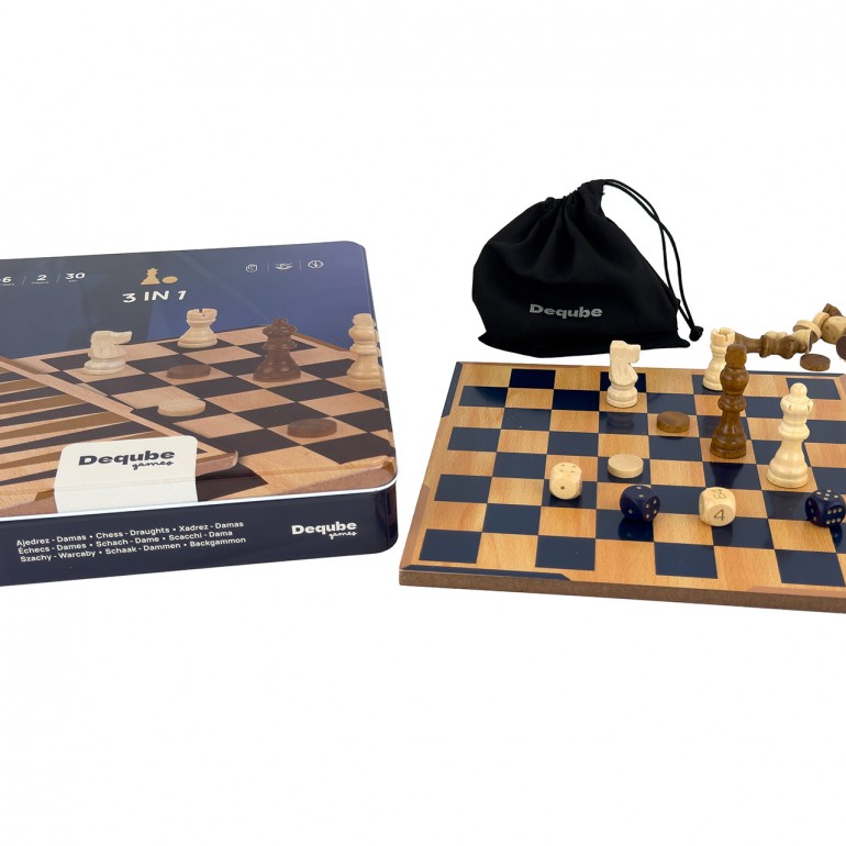 Tres juegos en uno: ajedrez, damas y backgammon. Este completo set en caja metálica incluye piezas de madera FSC y tablero reversible. Ideal para quienes disfrutan de la estrategia, la calidad y la versatilidad en un solo producto.