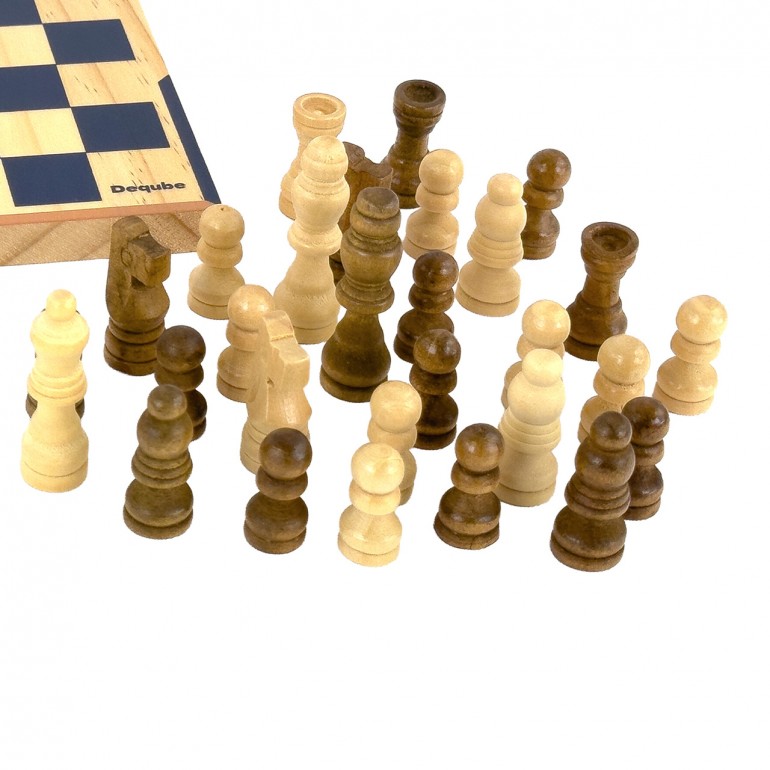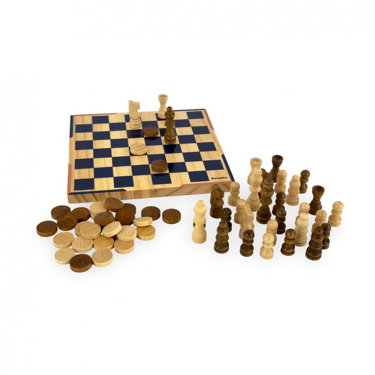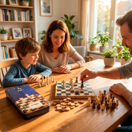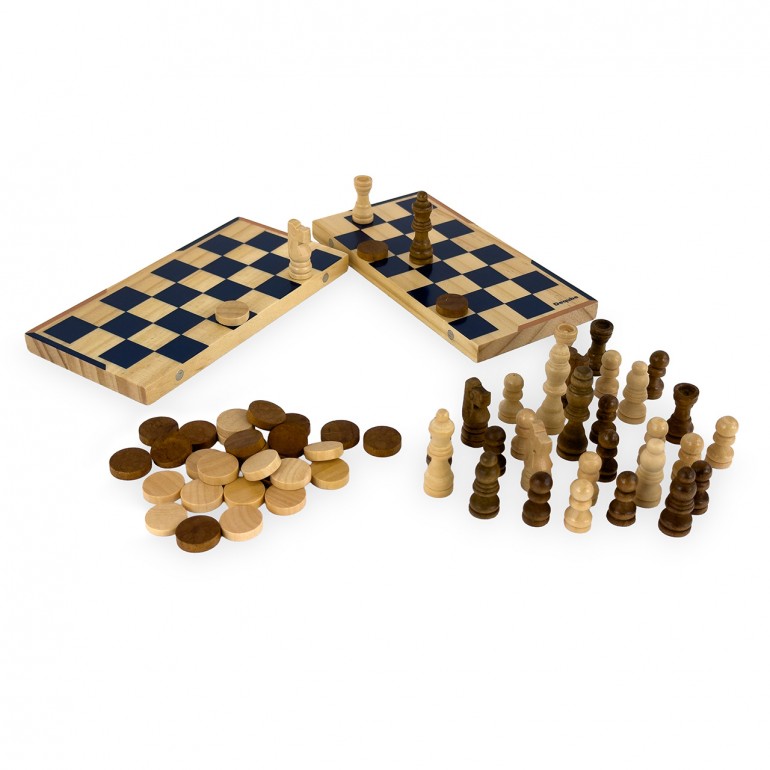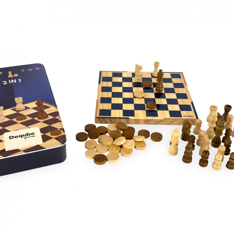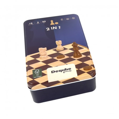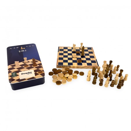 Set de ajedrez y damas en formato de viaje, con piezas de madera FSC y tablero compacto. Su caja metálica facilita el transporte y almacenamiento. Perfecto para disfrutar del juego en cualquier lugar con estilo y sostenibilidad.