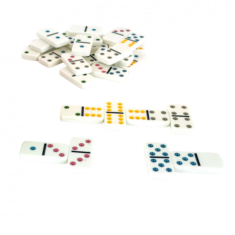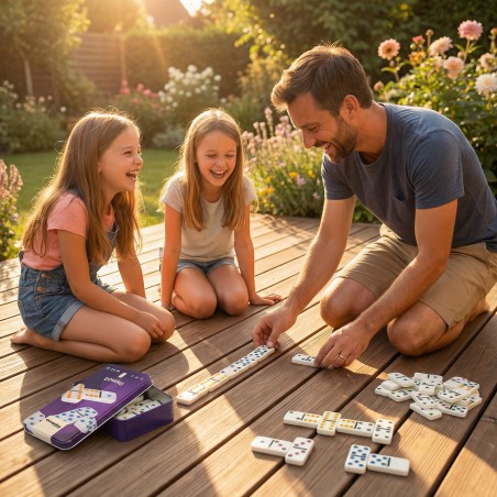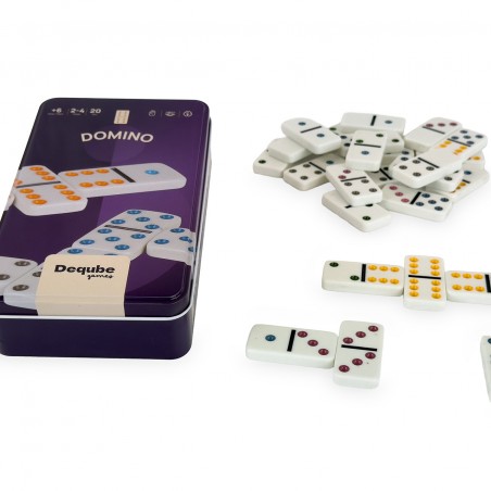 Juego de dominó Doble 6 con fichas resistentes y una práctica caja metálica. Ideal para reuniones familiares o entre amigos. Diseño tradicional y duradero que garantiza horas de diversión y estrategia.