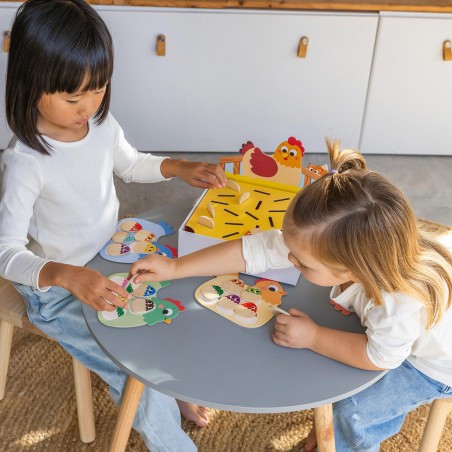 Juego de mesa preescolar para niños a partir de 3 años en el que deberán encontrar los pollitos escondidos en el gallinero. Incluye dos modalidades de juego diferentes. Modo memo, los niños deberán encontrar los pollitos necesarios para completear su gallina. Modo loto, en el que deberán encontrar el mayor número de parejas de pollitos.