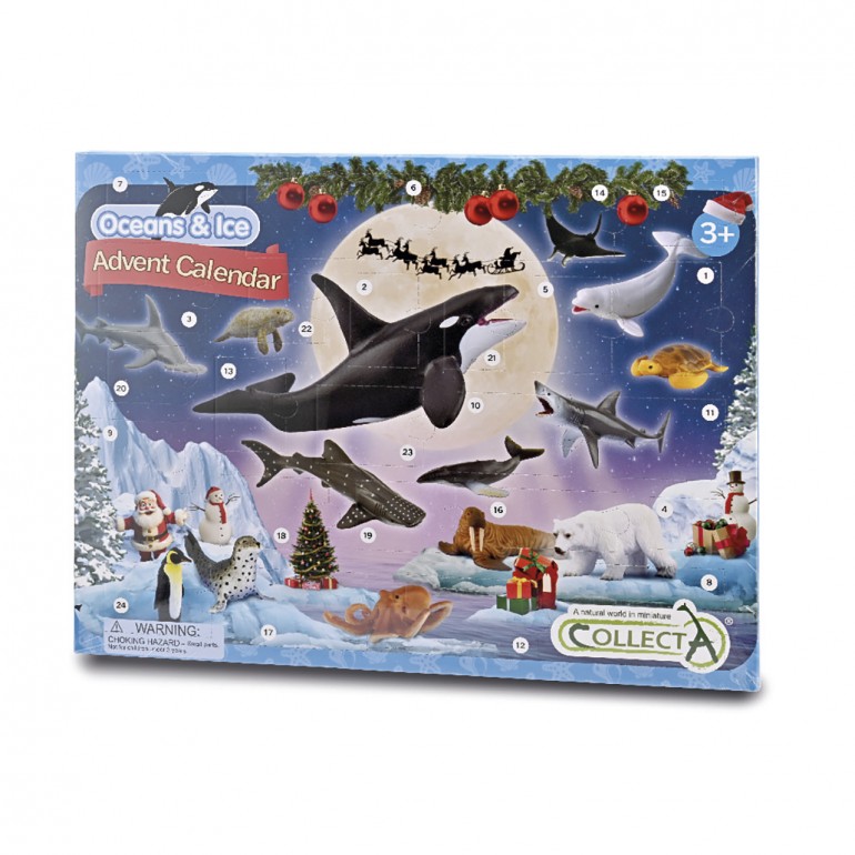 Esta adorable tradición no es conocida en todos los lugares, pero pertenece a la tradición cristiana de la temporada de Adviento. Es un calendario especial usado para contra los días de adviento previos a la navidad. Es conocido desde el siglo 19 y fue introducido por los Luteranos Alemanes. Hay muchas variantes del calendario de Adviento. Se hacen en multitud de formas desde un papel simple con tapas que cubren cada dia formando cajas que contienen pequeños artículos. La demanda ha hecho que Collecta desarrolle un calendario de Adviento de la línea AR de animlae marinos que está lleno con 24 mini figurines del mundo marino más 6 cartas AR. El panel trasero de la caja contiene un corte para formar una estructura con valor adicional para el juego.