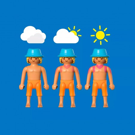 ¡Es hora de relajarse en la playa de PLAYMOBIL! Este soleado producto ofrece vibraciones veraniegas, con elegantes tumbonas y bebidas afrutadas hasta una palmera a la sombra y un atuendo cambiante para la mujer. El hombre lleva un estampado sensible a los rayos UV que revela las quemaduras solares bajo la luz del sol real: ¡no olvides la crema solar! Llena la bolsa de playa y la nevera con todos los accesorios necesarios para pasar un día perfecto junto al mar.