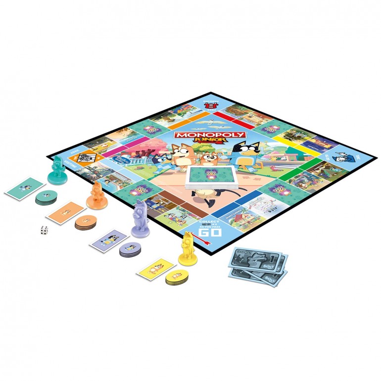 En este juego de mesa Monopoly Junior, puedes imaginar que vives divertidas aventuras en el pueblo con Bluey y su familia.