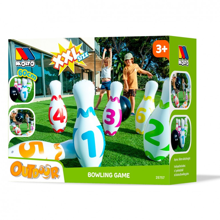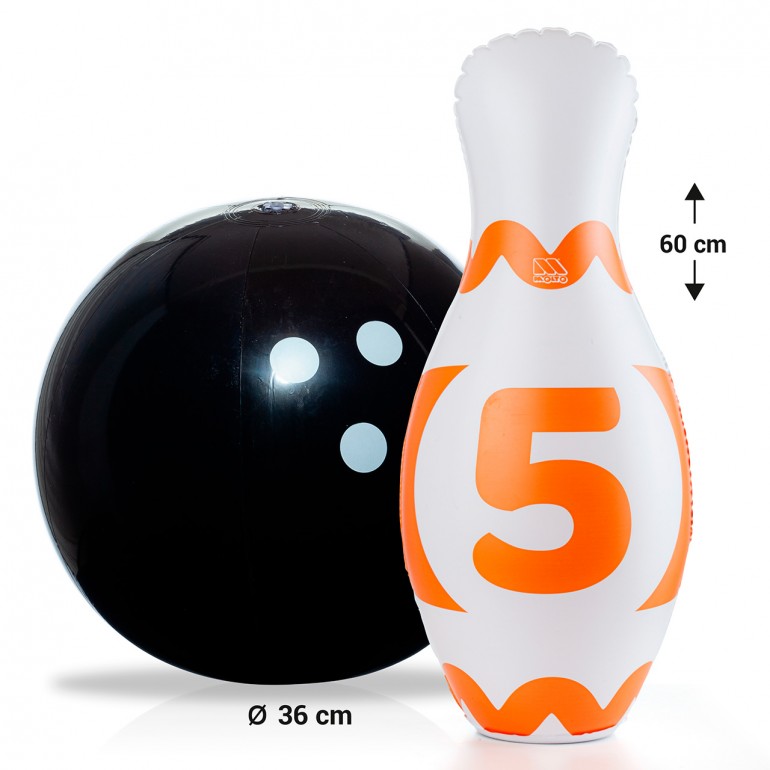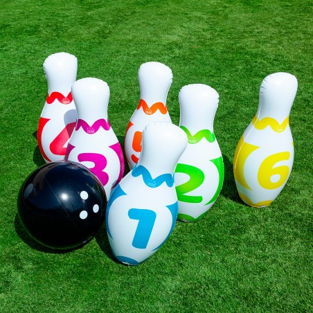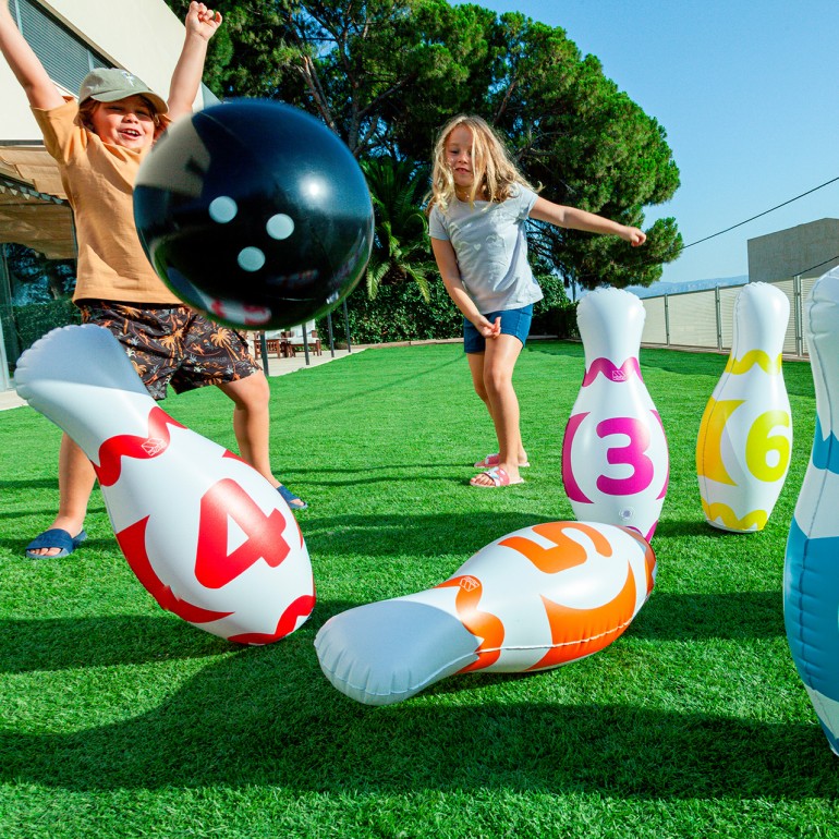 Juego de bolos inflable gigante de 60 cm. Diversión sin fin para niños y adultos. Incluye 6 bolos y una pelota. Perfecto para reuniones, fiestas y eventos, tanto en interiores como al aire libre. ¡Ideal para cumpleaños y días de juego!
