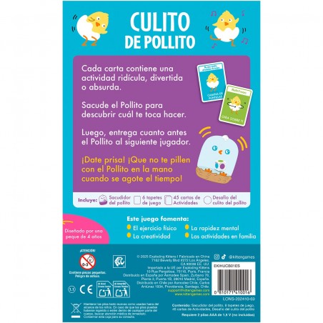 ¡Sacúdeme el culito! Cada carta contiene una actividad ridícula, divertida o absurda. Sacude el Pollito para descubrir cuál te toca hacer. Luego, entrega cuanto antes el Pollito al siguiente jugador. ¡Date prisa! ¡Que no te pillen con el Pollito en la mano cuando se agote el tiempo!