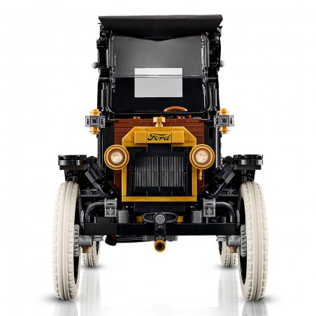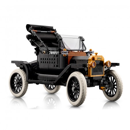 Rinde homenaje a un icono de la historia del automóvil con el kit LEGO Icons Ford Model T para adultos. Esta réplica del vehículo de la década de 1910 cuenta con capota de tela plegable, parabrisas dividido abatible y una única puerta, situada en el lado del acompañante. Incluye un maletero que se abre y un detallado habitáculo con sistema de dirección. Levanta el asiento para acceder al depósito de carburante y también los paneles del capó para ver el motor. Luego acciona la manivela para que gire el ventilador. Con carrocería negra, detalles dorados y llantas altas de radios con neumáticos estrechos de goma blanca, este modelo de coche antiguo es una elegante pieza de exposición para tu hogar. El set contiene 1060 piezas.