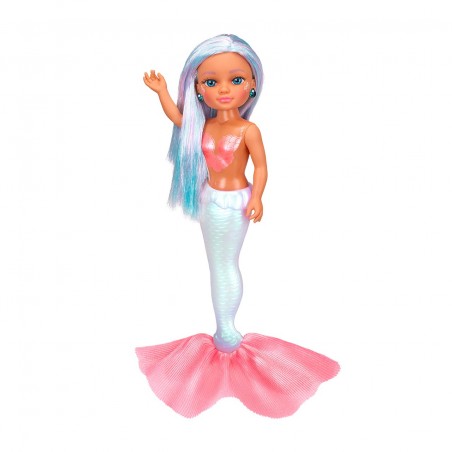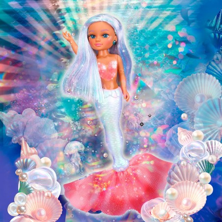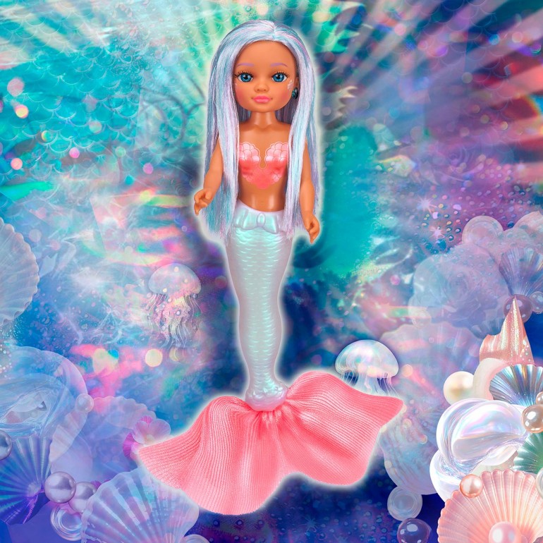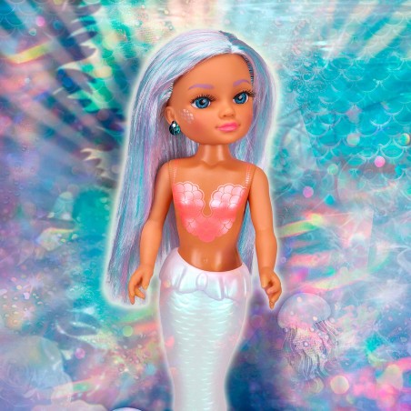 Nancy Perla llega con un espectacular look acuático lleno de brillo. Su cola de sirena y top con efecto perlado e irisado permiten jugar dentro y fuera del agua. Completa su estilo con cabello luminoso, pendientes de concha y maquillaje de escamas con efecto perla, siguiendo la tendencia glossy glam.