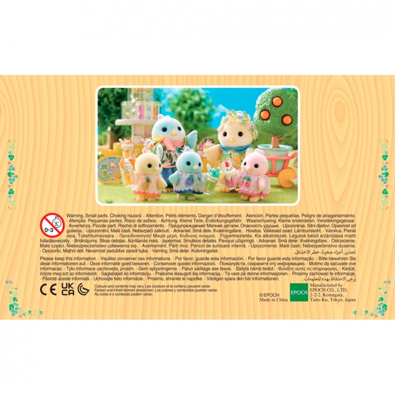 ¡La familia Pájaro Cítrico ha llegado a la Aldea Sylvanian! El set incluye árbol de naranjas en maceta, carro con cesta, regadera, naranja x3 y 4 figuras: mamá y 3 bebés.
