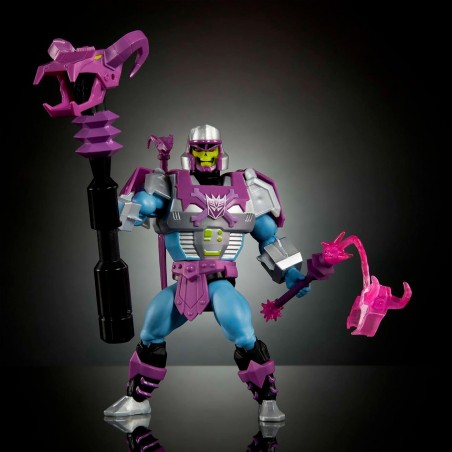 Esta figura de acción de MOTU Origins es fruto de una potente fusión del villano principal de Masters of the Universe con el aspecto blindado del villano estrella de Transformers: ¡es Skeletor con armadura de Megatron! Esta figura a escala de 13,97 cm de Skeletor con armadura de Megatron tiene 16 articulaciones móviles para adoptar poses de batalla y hacer movimientos de acción. Las armas también representan una combinación de las emblemáticas marcas, con una Maza de Energon que se conecta a la muñeca de la figura, una Espada con cabeza de carnero y un cañón estilo Decepticon que se convierte en un Báculo Havoc.