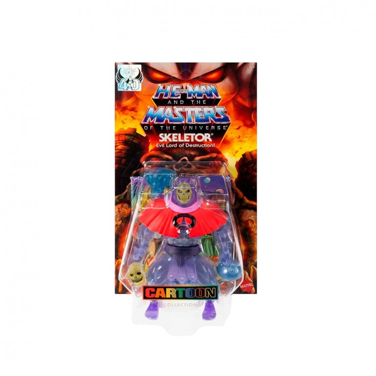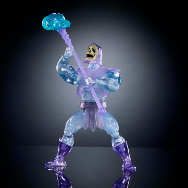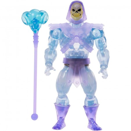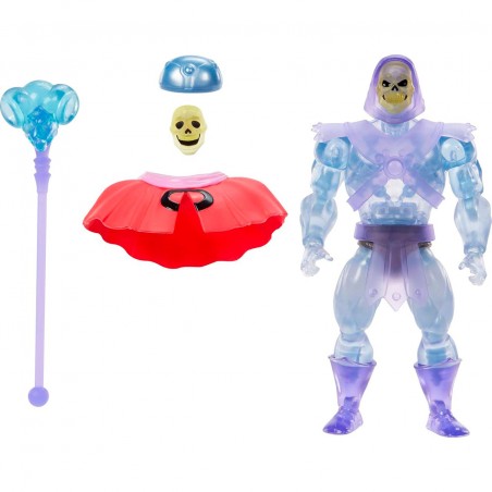 Este juguete de MOTU es un modelo moderno del look clásico de los años 80 de la malvada némesis de He-Man a escala de 14 cm, pero con 16 puntos de articulación para adoptar todo tipo de poses. El aspecto del Skeletor invisible, incluidos su translucidez, su capa y su casco de invisibilidad extraíbles, están inspirados en el episodio Un acto de desaparición. También viene con un accesorio de placa facial alternativa.
