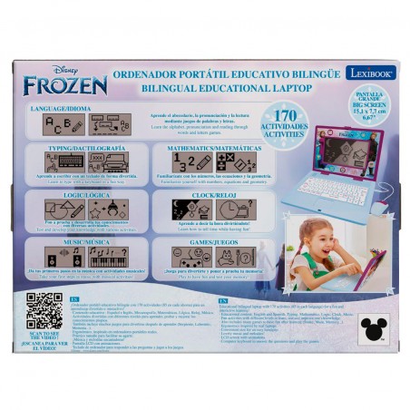 ¡El portátil perfecto para aprender divirtiéndose! Gracias a este portátil educativo, los niños pueden aprender y descubrir una gran variedad de temas mientras se divierten con sus personajes favoritos de Frozen. Gracias al ratón suministrado, es muy fácil navegar por las 170 actividades (85 en cada idioma). Estas actividades se dividen en 5 temas: Aprendizaje de palabras, Matemáticas, Música, Conocimiento, Lógica y Juegos. En cada tema, hay varias actividades con distintos niveles de dificultad.
