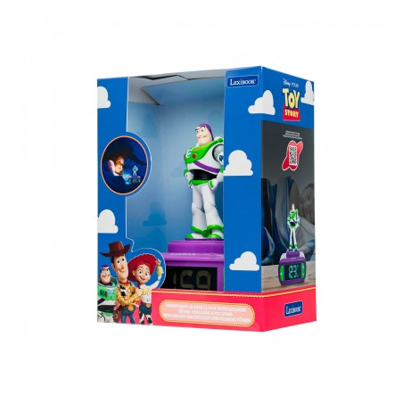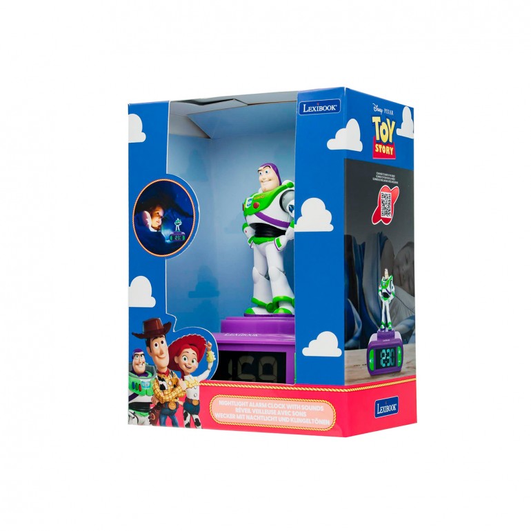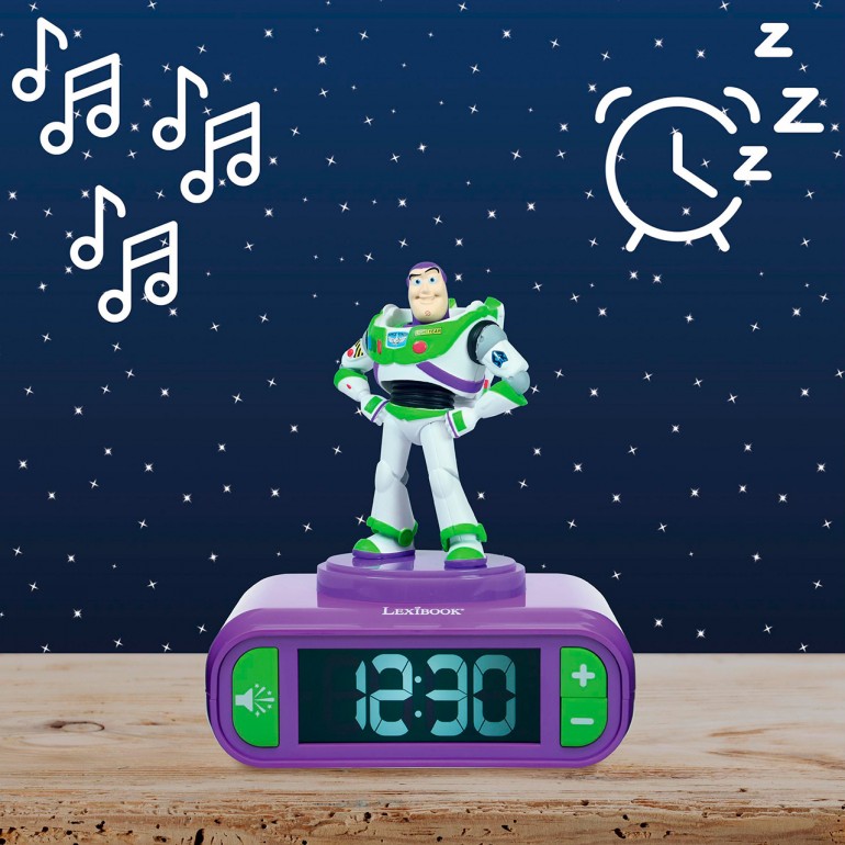 A la hora de dormir, Buzz Lightyear se ilumina durante unos minutos gracias a la función de luz nocturna. La pantalla LCD retro iluminada indica la hora de forma digital. Alarma con opción de despertarse con sonidos extraídos del universo de Toy Story.