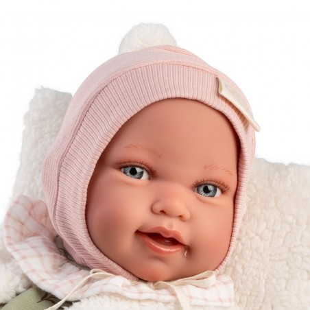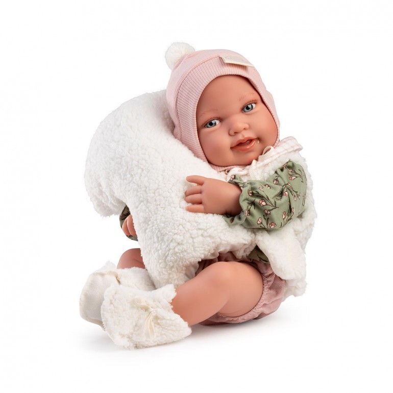 Pipa es pura dulzura. Con su chaleco de borreguito, está lista para estar siempre calentita y mimada. Es de esas muñecas que invitan a cogerlas en brazos y no soltarlas, perfecta para acompañar a los peques en sus juegos de cuidado y ternura. Con sus 42 cm y su cuerpo de vinilo sexuado, Pipa es realista y adorable a partes iguales. Lleva un look completo con braguita, blusa, ese chaleco de borreguito que es una monada, peucos, gorro y hasta su propio cojín.