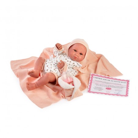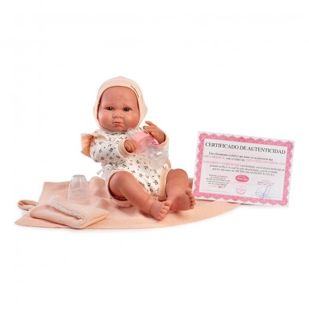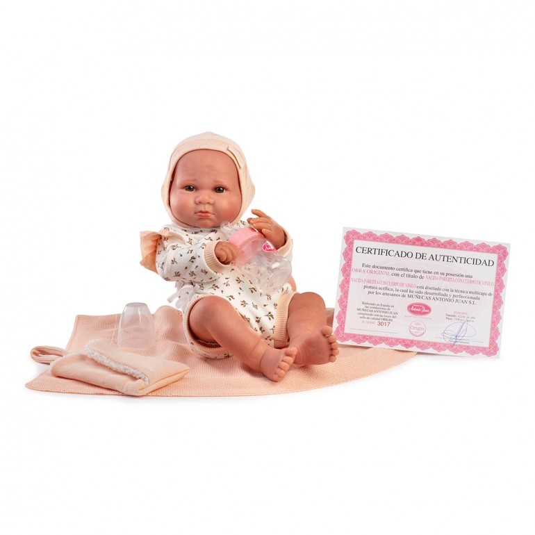 Sweet Reborn Luca con biberón de Muñecas Antonio Juan es una muñeca realista que captura la ternura y el encanto de un bebé recién nacido. Esta preciosa muñeca está fabricada en vinilo de alta calidad, ofreciendo un acabado suave y detallado que imita la textura de la piel real, proporcionando una experiencia táctil auténtica durante el juego. Luca viene acompañada de su biberón, permitiendo a los niños recrear momentos de cuidado y alimentación de manera realista. El conjunto incluye una manta suave en tonos melocotón y un certificado de autenticidad que garantiza que se trata de una obra original de Muñecas Antonio Juan.