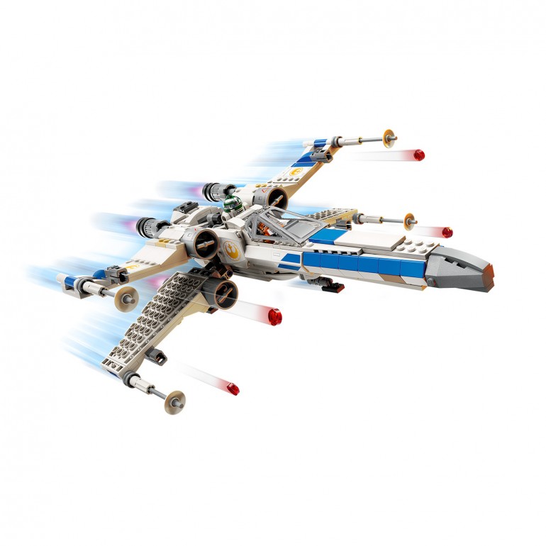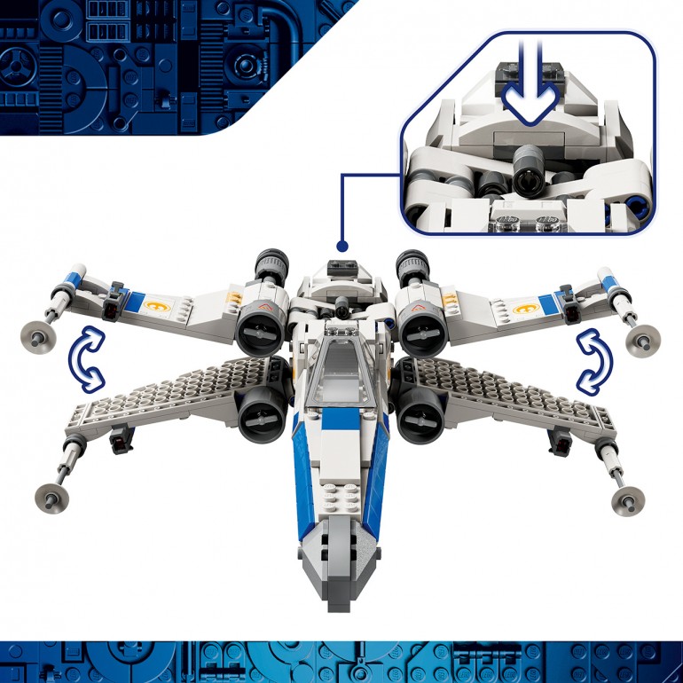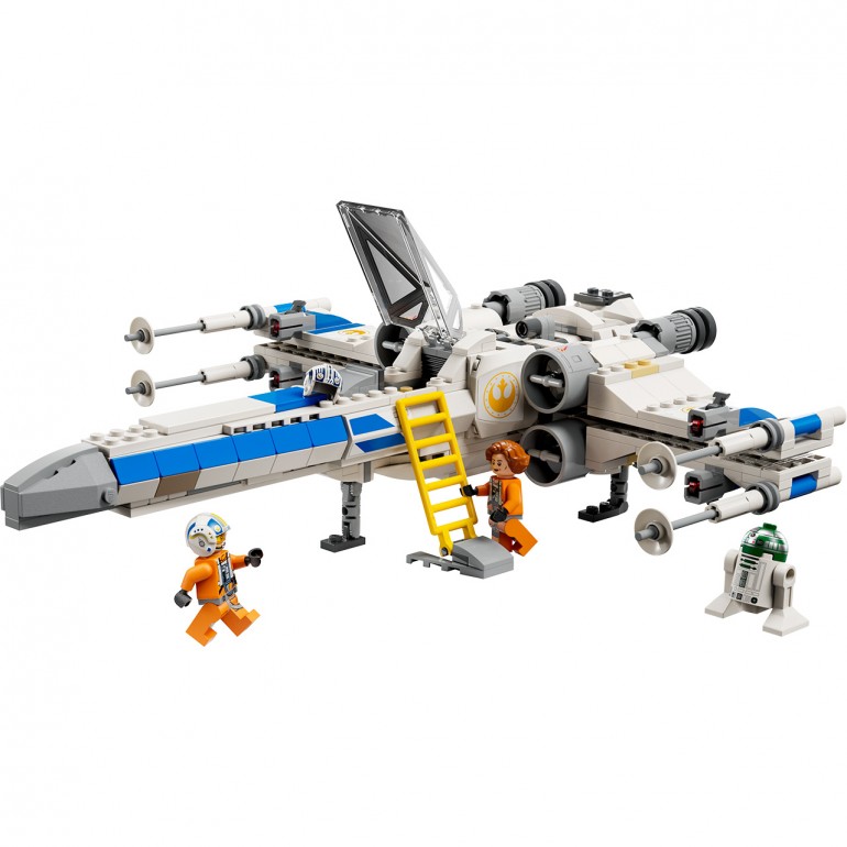 Reproduce el diseño clásico del Ala-X y los llamativos colores azul y blanco de la Nueva República, como en Star Wars: The Mandalorian and Grogu. Guarda el equipo en el compartimento trasero y revisa los motores para prepararte para la batalla. Pilota el caza estelar con la minifigura LEGO de la Coronel Ward o de Carson Teva y coloca la figura LEGO del droide astromecánico de la Nueva República detrás de la cabina. Retrae el tren de aterrizaje, pulsa el botón para ajustar las alas a la posición de ataque y activa los 4 cañones. Contiene 558 piezas.
