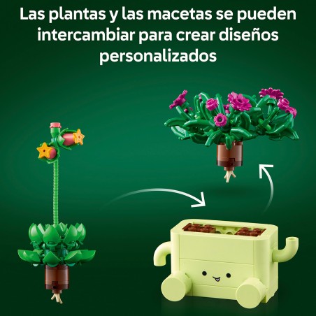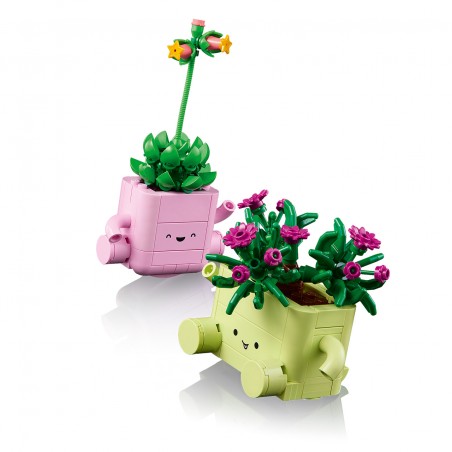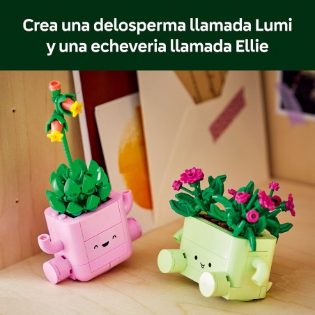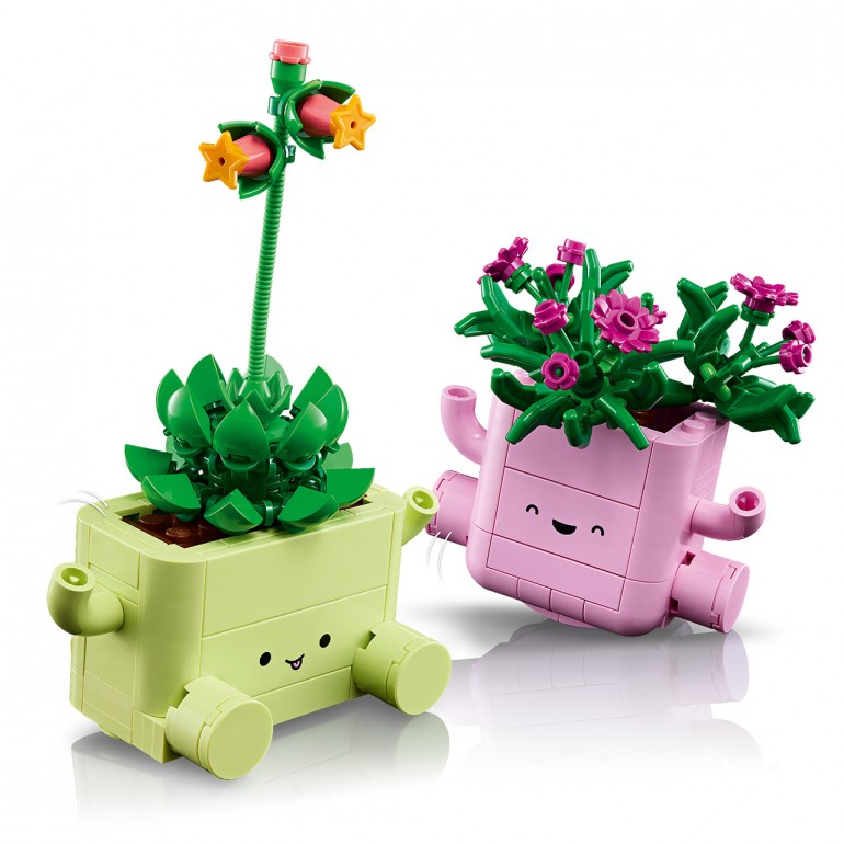 ¡Construye y expón una colorida pieza de decoración vegetal llena de ritmo con el set LEGO Botanicals Plantas Bailarinas para niñas, niños y amantes de la naturaleza! Transmite felicidad creando 2 alegres modelos de plantas LEGO en macetas de colores pastel: una Delosperma (planta de hielo) llamada Lumi con capullos violeta y una Echeveria llamada Ellie con tallo largo y capullos coral. Las macetas tienen adorables caras sonrientes y bases redondeadas, así que se balancean al darles un empujoncito: la verde pálido baila hacia delante y hacia atrás, y la rosa pálido de lado a lado.