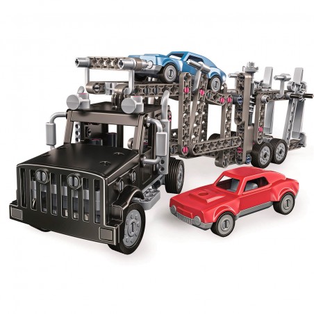 Un set de construcción para montar un transportador de automóviles realista, con cubierta superior móvil y rampas traseras basculantes. El modelo integra un sistema de dirección que funciona y engranajes que permiten observar los principios de la mecánica en la práctica.