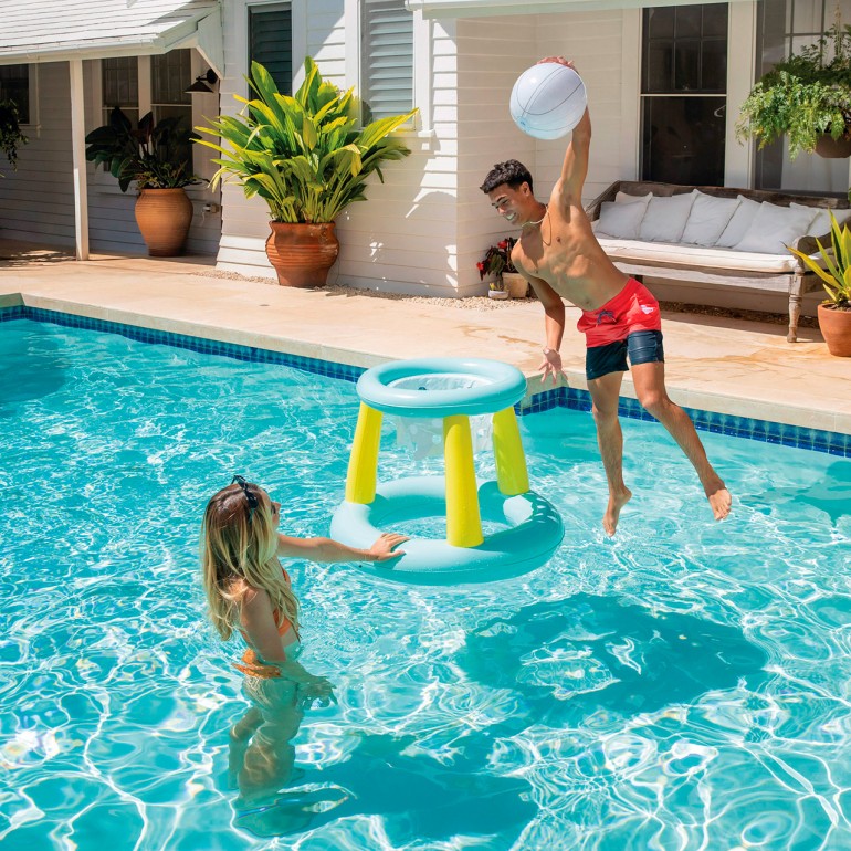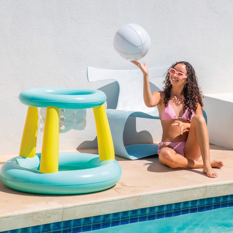 ¡Convierte tu piscina en una cancha de diversión con este juego de baloncesto hinchable! Con forma de aro flotante y diseño en colores pastel, este set incluye un balón blando e hinchable para lanzar a canasta y disfrutar en familia o con amigos. Sus medidas (Ø 86x64 cm) lo hacen perfecto para piscinas grandes y pequeñas.