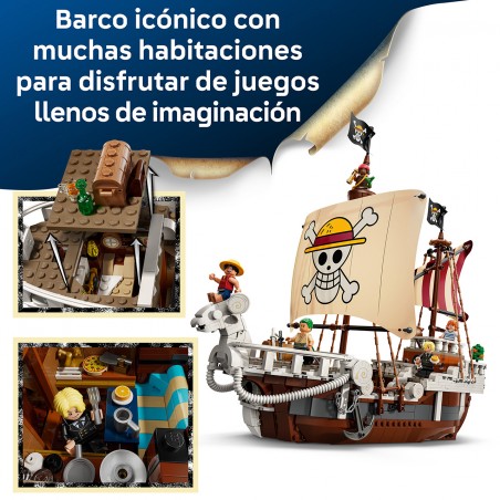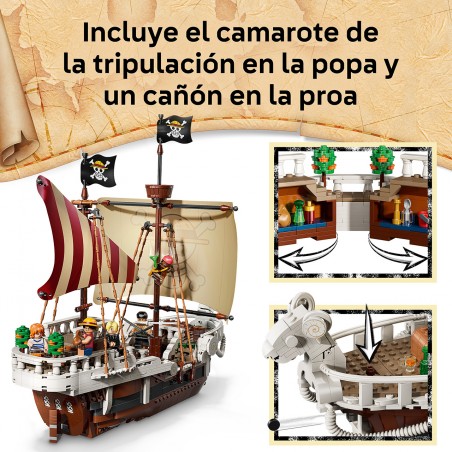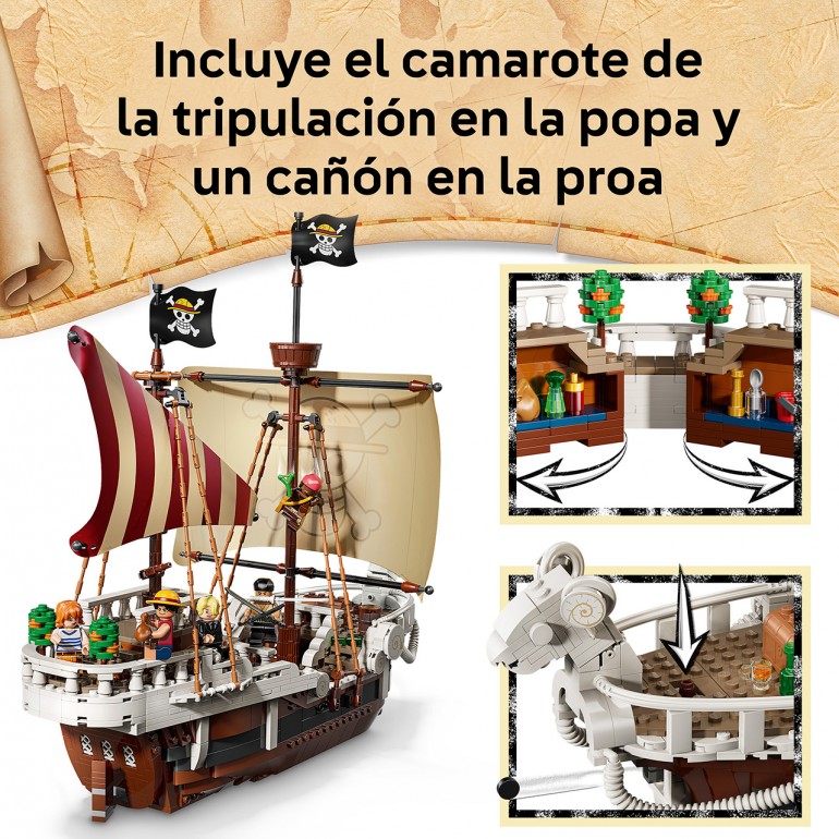 Este emblemático barco cuenta con diversos espacios: el camarote de la tripulación, la cocina, un almacén y un taller de accesorios. El modelo viene con 5 minifiguras LEGO ONE PIECE: Luffy se sienta en el mascarón de proa con forma de carnero, que tiene un cañón debajo; Zoro se relaja y entrena en la cubierta; Nami controla el timón en la parte posterior, rodeada por mandarinos, sus árboles favoritos; Usopp escala los mástiles y vigila desde la cofa; y Sanji baja las cazuelas a la cocina. Incluye 4 carteles de Se busca. La app LEGO Builder permite a los peques acercar y girar versiones 3D de los modelos y consultar su progreso. El set contiene 1376 piezas.