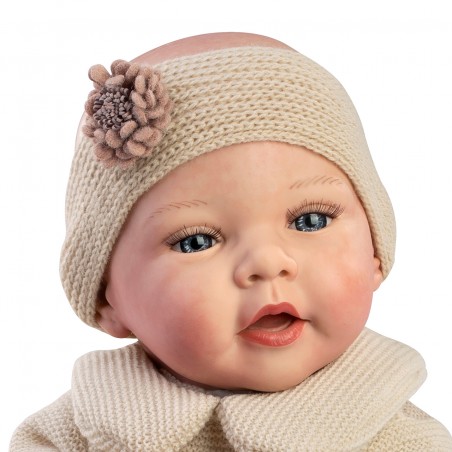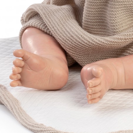 Muñeca Reborn Montessori Nuria, diseñada para ofrecer una experiencia de juego realista y educativa a niñas y niños. Esta muñeca, de 42 cm, viene vestida con un adorable pelele de lana en color beige, acompañado de una diadema a juego y una mantita. Su diseño sin pelo añade un toque único, permitiendo a los pequeños centrarse en el cuidado y la interacción.