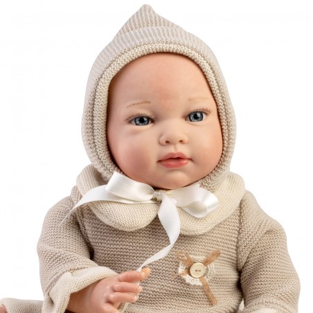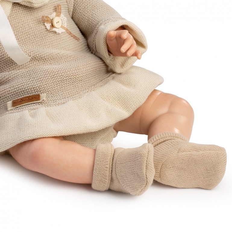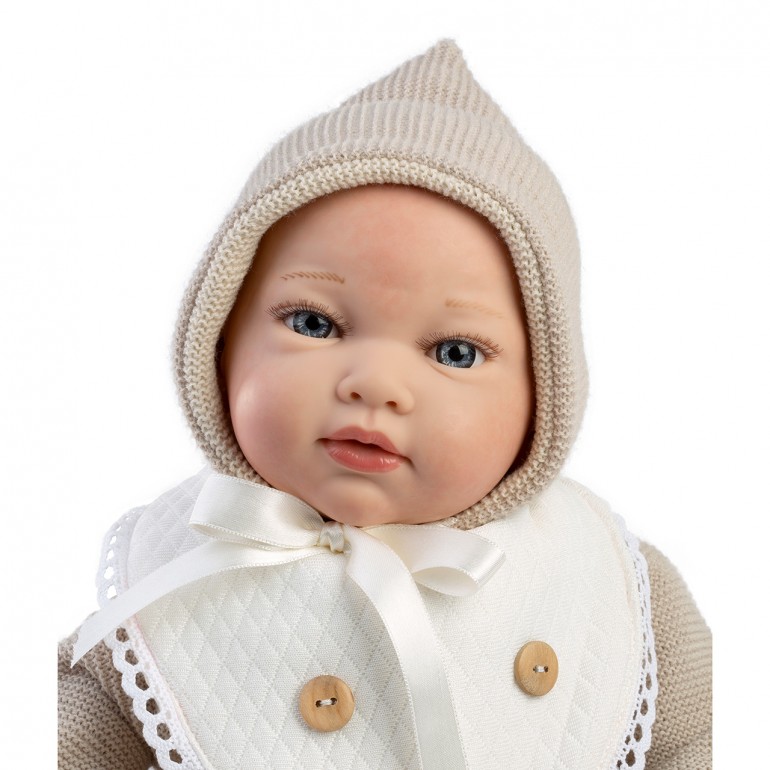 Muñeca Reborn Montessori Ivana, diseñada para proporcionar una experiencia de juego realista y educativa a niñas y niños. Esta muñeca, que mide 42 cm, destaca por su vestimenta de lana beige, que incluye un vestido, un gorro, calcetines y un babero. La muñeca no tiene pelo, lo que facilita su mantenimiento y limpieza.