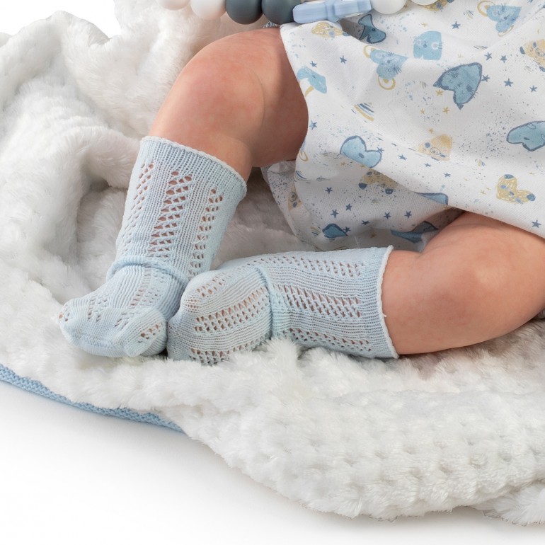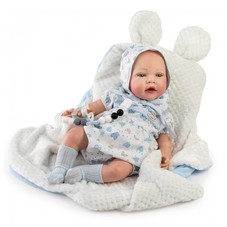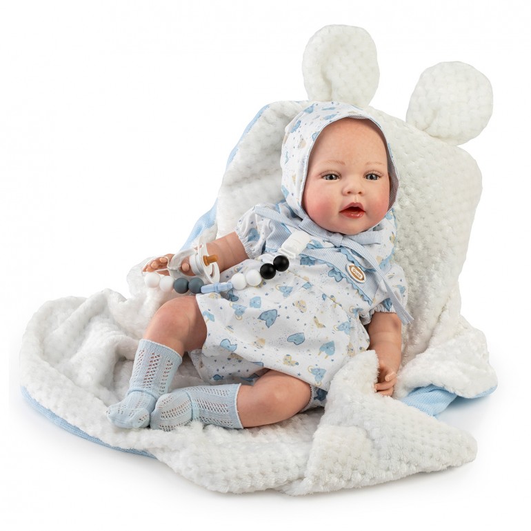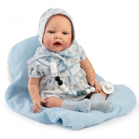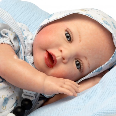 Muñeco Reborn Alexis es una pieza única que destaca por su realismo y detalle. Con un tamaño de 42 cm, este muñeco está diseñado para parecerse a un bebé real, ofreciendo una experiencia de juego enriquecedora para niñas y niños. Alexis viene vestido con un babero blanco y azul, acompañada de una capota, calcetines y una mantita, todos confeccionados con materiales de alta calidad que garantizan durabilidad y suavidad al tacto.