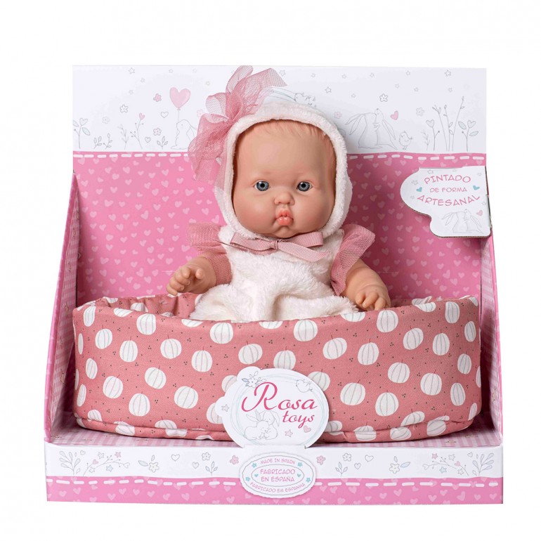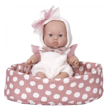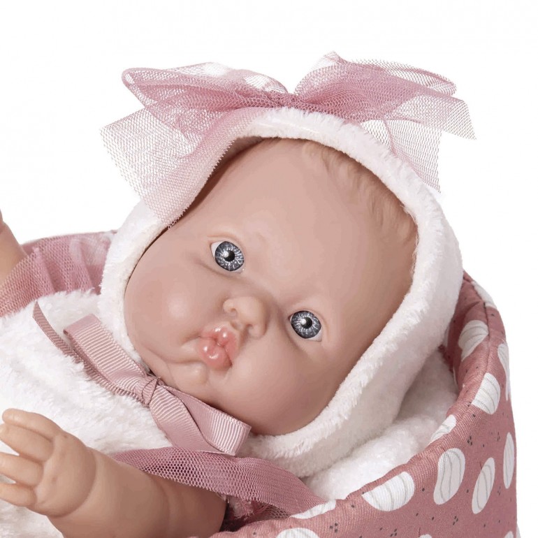 Este simpático muñeco de rasgos dulces y mofletes redondeados viene acompañado de su propio capazo de tela a juego. Está fabricado con cuerpo íntegramente de vinilo de tacto suave. Viste un delicado conjunto blanco con un gorrito y un gran lazo rosa, perfecto para transportarlo y cuidarlo en cualquier lugar.